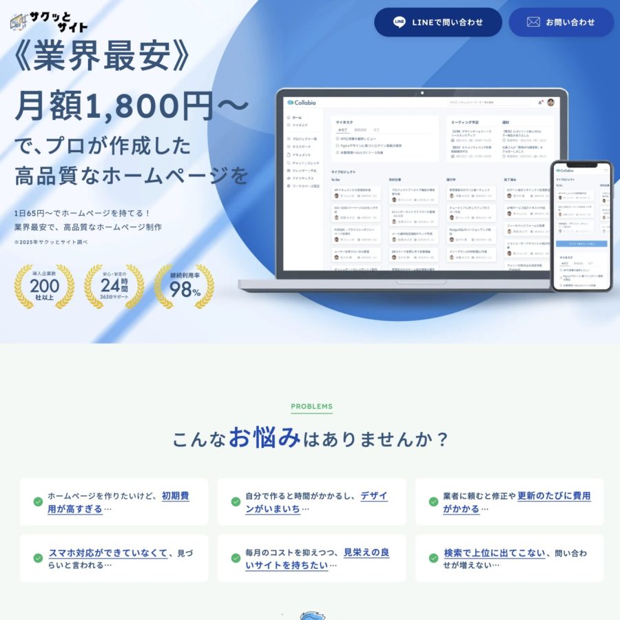 「サクッとサイト」は月額1,870円(税込)〜で業界最安値ため、開業したばかりの方や、まずはお試しでホームページを持ちたい方にも安心です。
