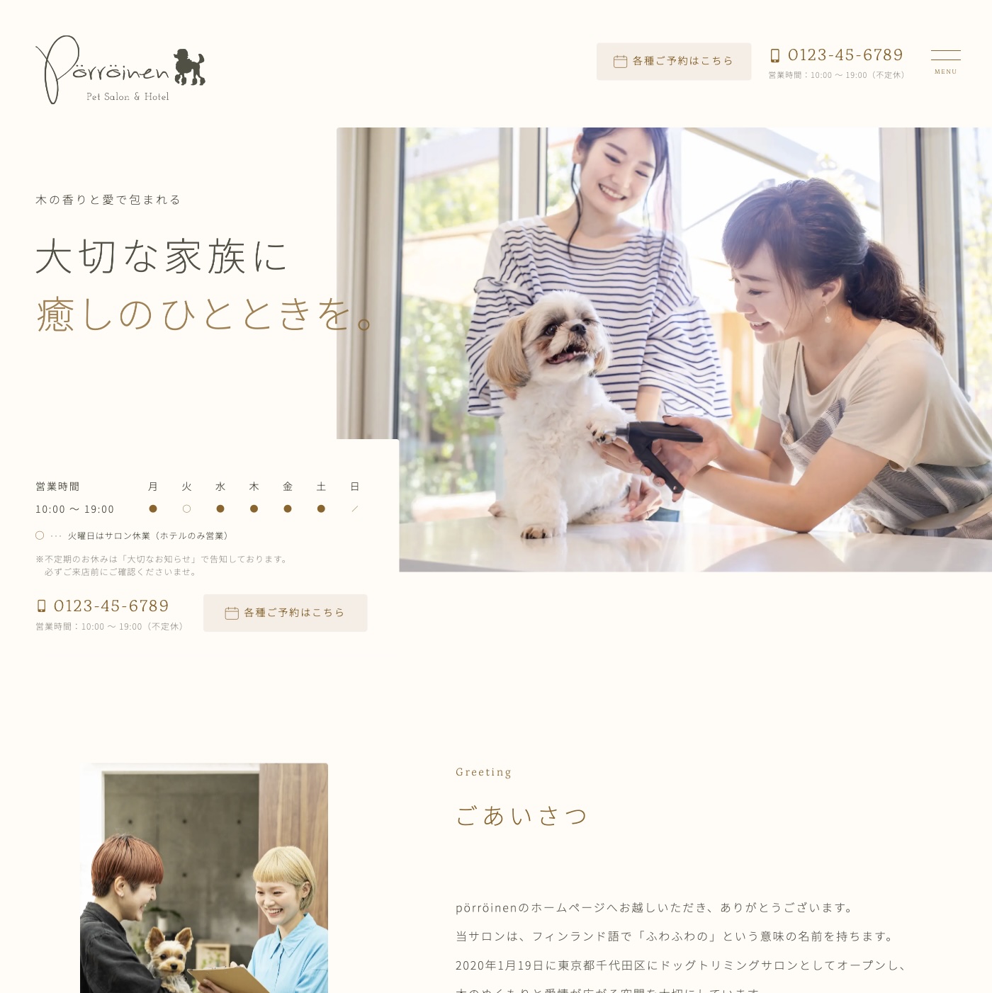 ![]() ペットサロン① | ・TOPページ ・サービスページ ・お知らせページ(一覧・詳細) ・BLOG(一覧・詳細) ・お問い合わせ ・プライバシーポリシー |