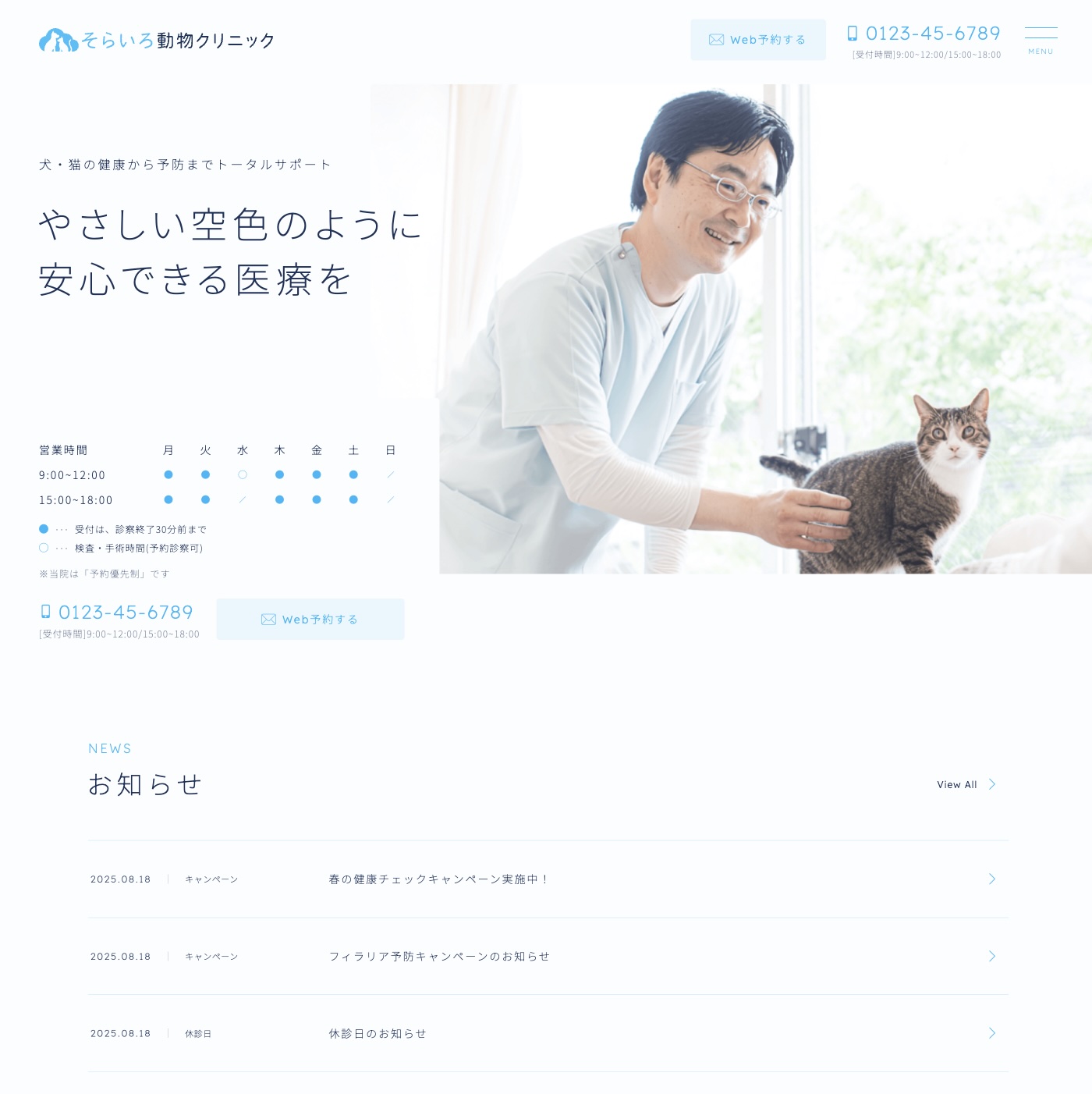 動物病院やペットサービス向けに、安心感と清潔感を大切にしたテンプレートです。