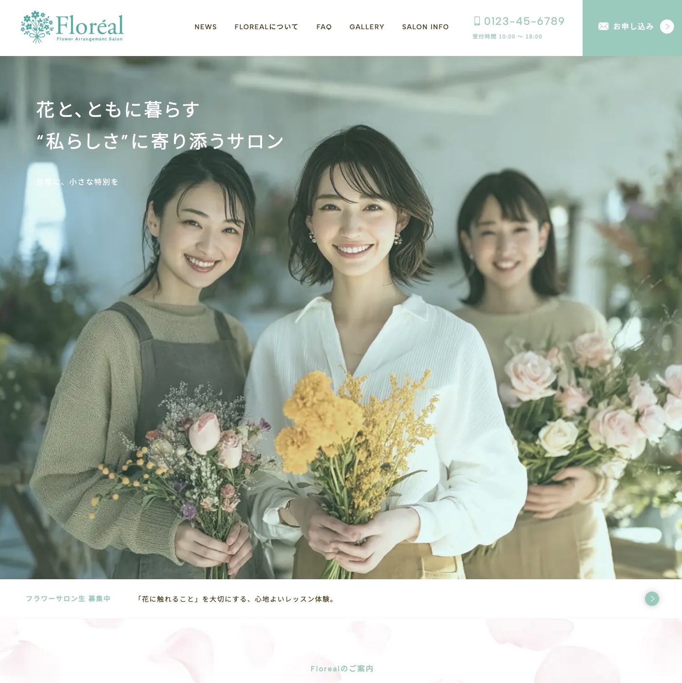 ![]() フラワー教室① | ・TOPページ ・サービスページ ・お知らせページ(一覧・詳細) ・BLOG(一覧・詳細) ・お問い合わせ ・プライバシーポリシー |