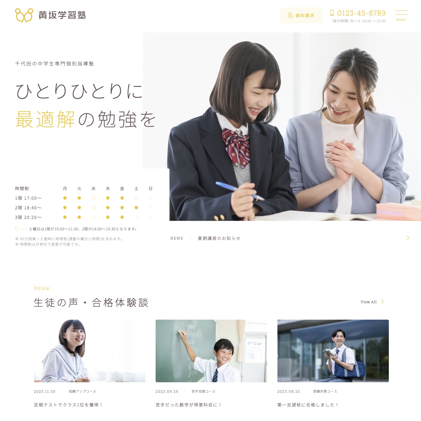 コース紹介、料金、講師情報を整理して掲載でき、保護者や生徒に安心感を与える構成。